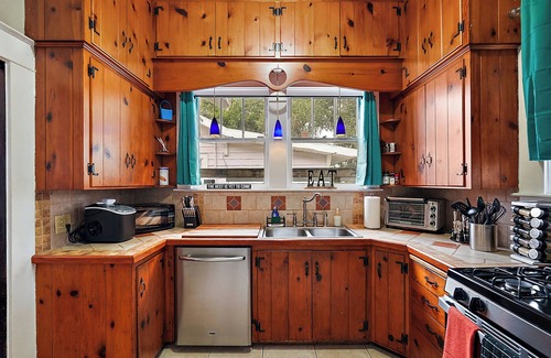 The kitchen area is a bright and airy space to enjoy with family and friends. With sleek stainless steel appliances and thoughtfully stocked cabinets, delicious meals are easy to prepare during your stay. There is even a dishwasher provided for your convenience- something that’s not so common in a bungalow like this!