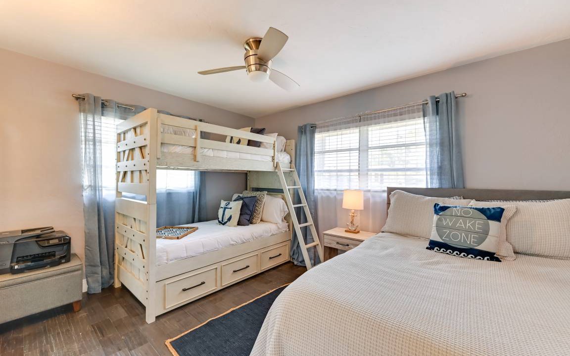 Bedroom 1: King Bed | Bedroom 2: Queen Bed, Twin Bunk Bed | Living Room: Queen Sleeper Sofa | Additional Sleeping: Pack 'n Play