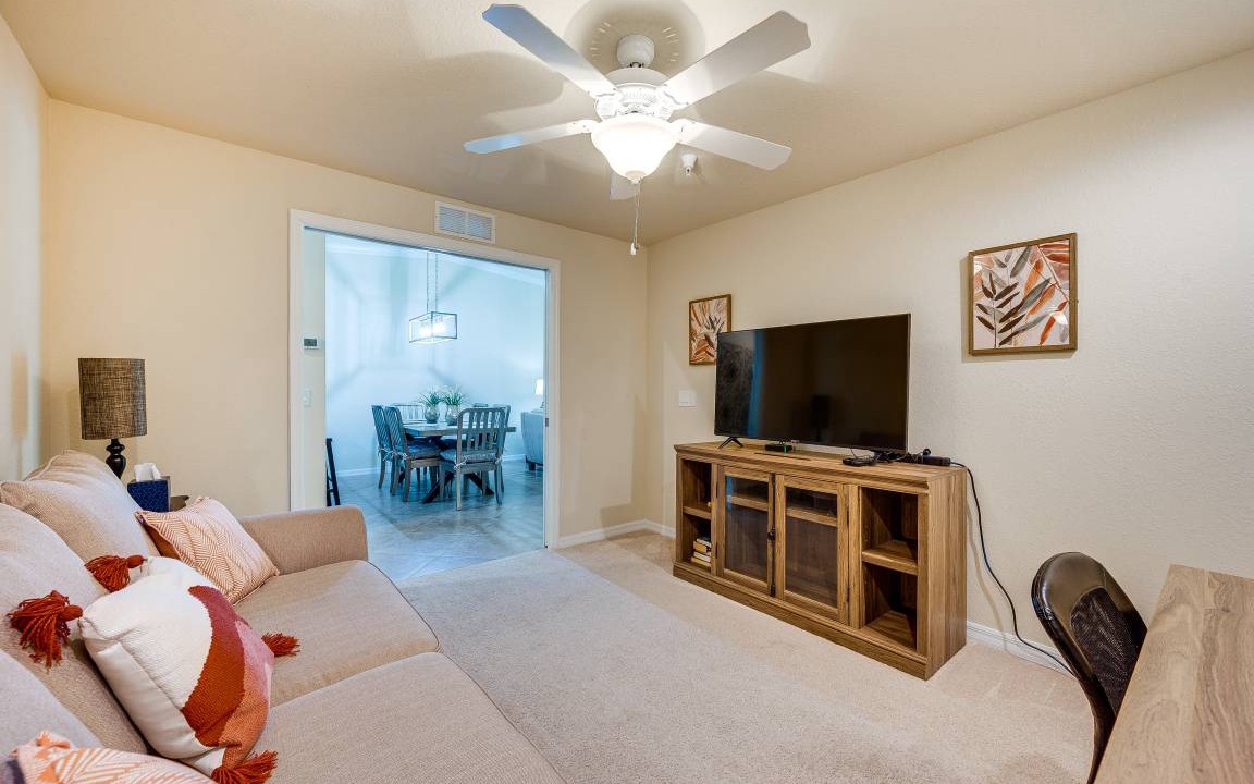 INDOOR LIVING: Smart TVs w/ cable, dining tables, open floor plan, en-suite bathrooms, desk workspace