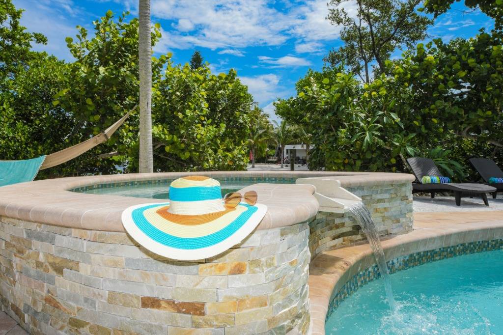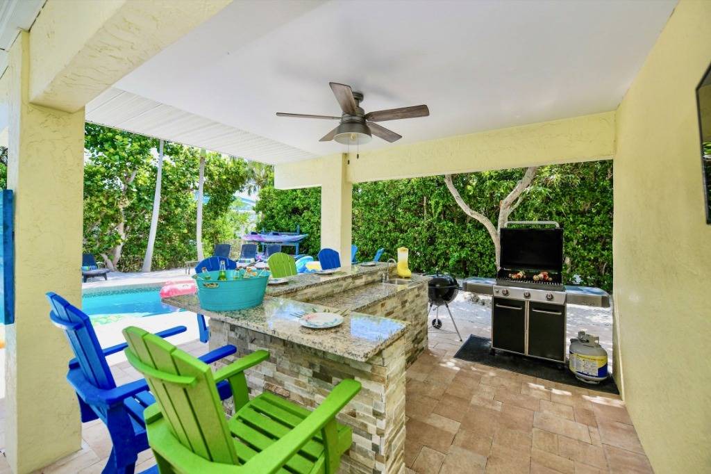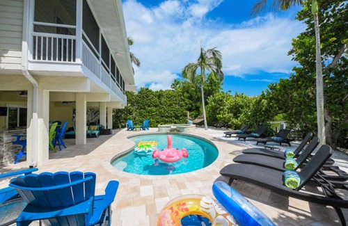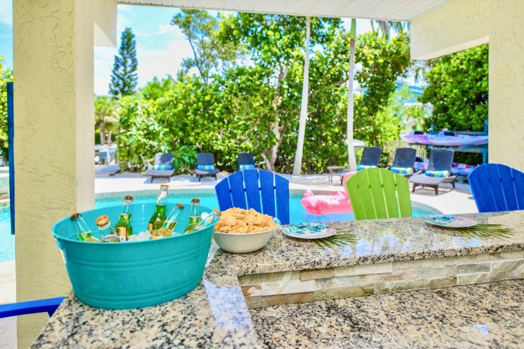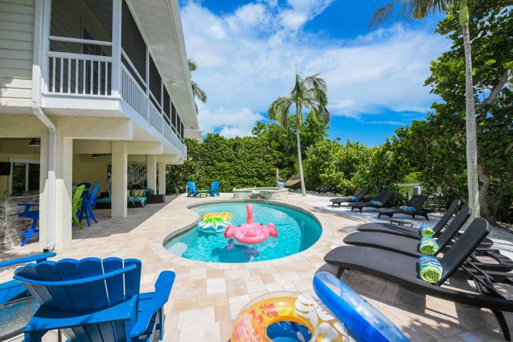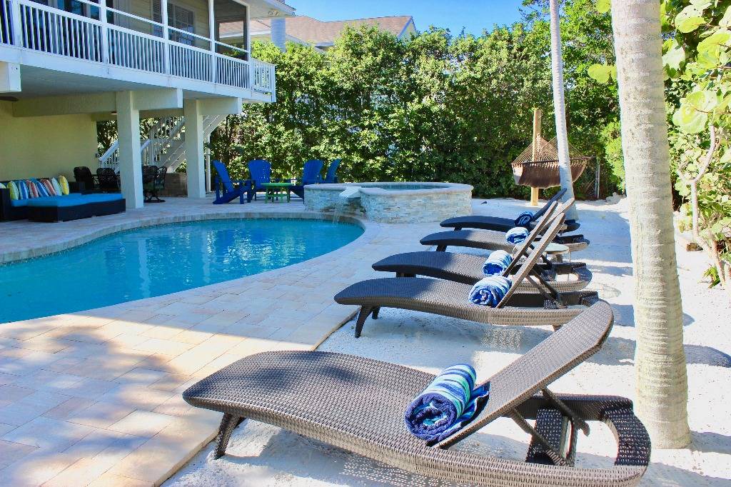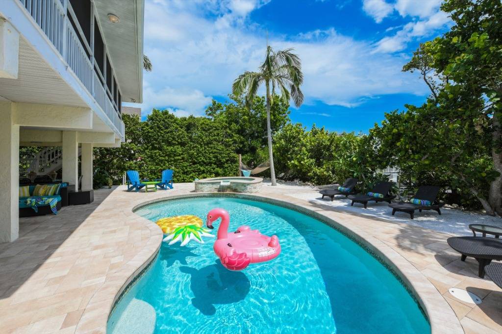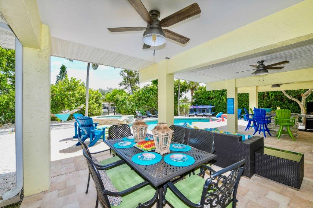 THE EXTERIOR ~~ Skip the beach altogether and rejuvenate in the private resort-style backyard complete with heated pool, hot tub, backyard beach, outdoor bar, Flat Screen TV, luxurious plush outdoor furnishings on both the large pool terrace and upper screened-in lanai. Although fishing and boating are the best way to enjoy Sirenia Cove we also have an easy kayak launch getting you onto Bimini Bay for water sports and enjoyment of Florida wildlife. Outside is where you should be living so we offer plush and luxurious seating areas reminiscent of luxury resorts. Our outdoor table for 6 (new table not shown) & bar area, alfresco poolside, is perfect to relax on while you watch the big game on the large flat screen. We also have a ping-pong table, dartboard and basketball net to keep the kid in you busy!