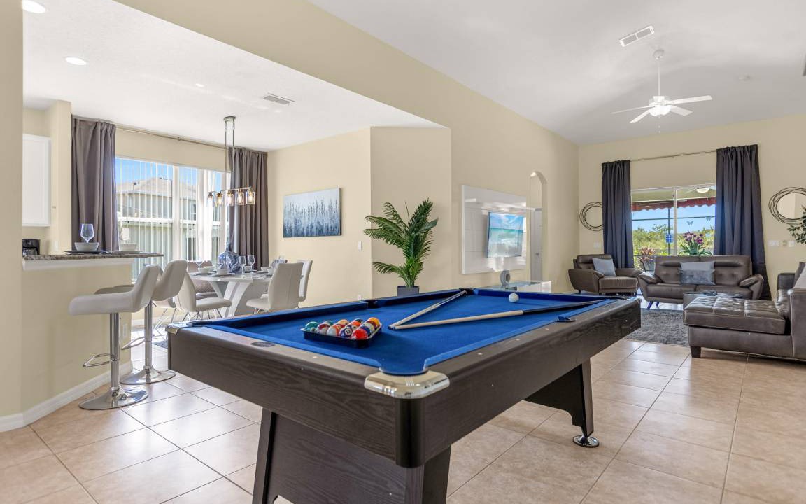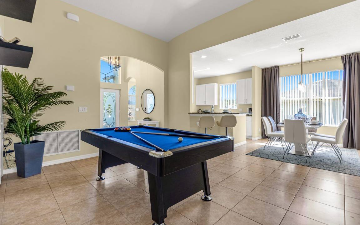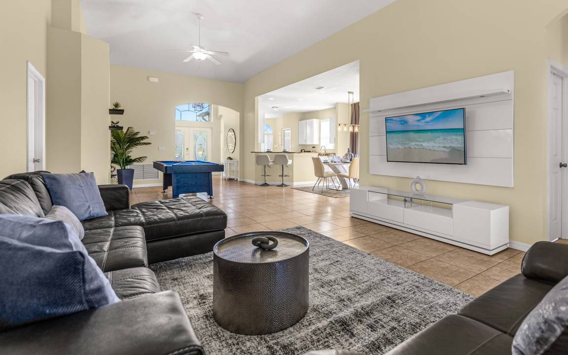 Step inside to the gorgeous open concept living space. You'll find a billiards table, plenty of comfortable seating and a smart TV.