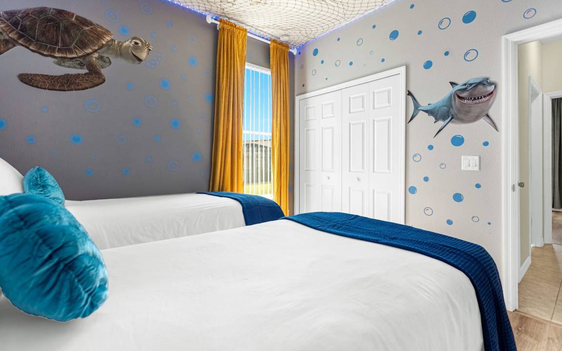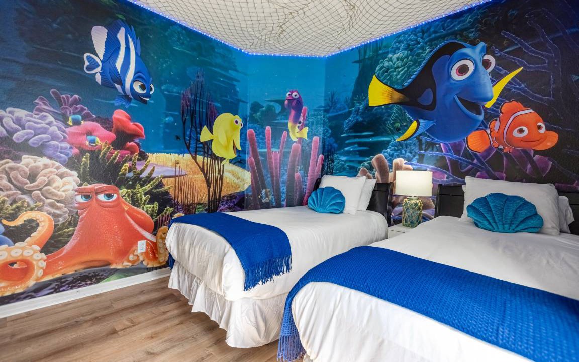 Kids will love the Finding Nemo-themed bedroom, featuring a colorful mural and two Twin beds. The primary bedroom offers a King-size bed and a sparkling ensuite bathroom with a soaker tub and large walk-in shower. Two additional bedrooms each have a Queen-size bed, with one also featuring an ensuite bathroom.