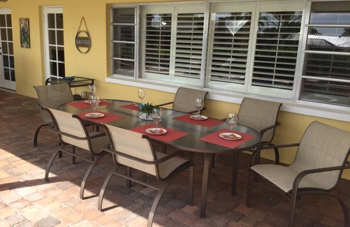 The backyard faces south and catches the sun all day. Enjoy the Gulf breezes while sun bathing or sit in the shade of the patio or palm trees. You will also frequently see dolphins swimming in the canal.