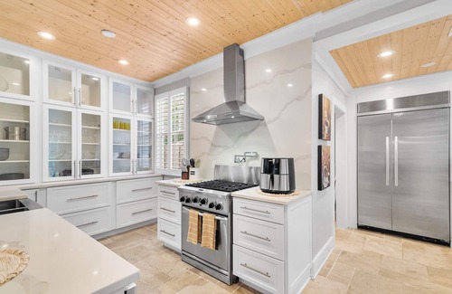Embrace your culinary creativity in our stunning kitchen, boasting gleaming stainless-steel appliances and unique, open plan design that sets the stage for your inner chef to flourish. With beautiful marble countertops, white cabinetry, and top-tier cooking tools at your fingertips, this charming space invites you to sear, simmer, and serve up gourmet dishes with our ideal set up: