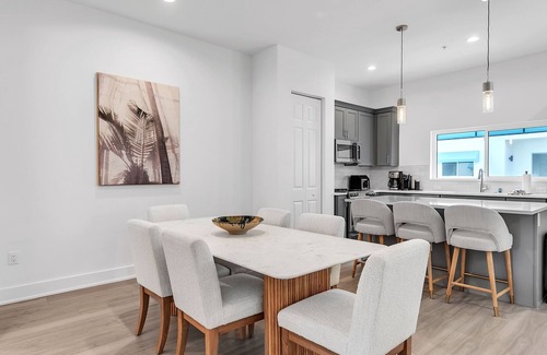 Both townhomes feature inviting living areas with big screen TV's, perfect for gathering together for movie nights, along with top-of-the-line kitchens stocked with everything you need—from cookware to dishware and brand-new appliances. A large dining table in each townhome offers a great spot for group meals or a fun game night. And each townhome also has a private balcony off of the dining area complete with table and chairs for some extra space and outdoor dining.