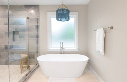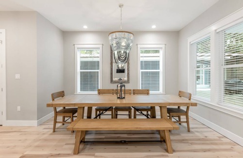 Inside, the gorgeous, open living and dining area is great for quality time, while the chef's kitchen is a dream come true. The spacious home comfortably sleeps 12. On the first floor, a guest room, queen, features a gorgeous full bathroom.