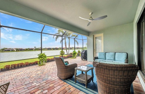 This home comes completely furnished with quality furnishings. Open concept floor plan with large kitchen, dining area, family room and breakfast nook overlooking a large lake. This is actually a four bedroom home with one bedroom reserved for storage of the owner’s belongings. Ample space to sleep 6 people comfortably. The Master Suite, which also has a wonderful lake view, has a king size bed, a large bathroom with soaking tub and a spacious walk in closet. TV/cable in the Master Bedroom. The second bedroom has a queen size bed with TV/cable as well and the third bedroom has a full size bed The spacious kitchen has granite countertops and stainless steel appliances. There is a breakfast bar as well with seating for 4 people. The home features a large screened in lanai which includes a covered seating area to enjoy the serene lake views. There is a barbeque grill for use of the guests as well as a propane heater for those cool nights. $500 transfer