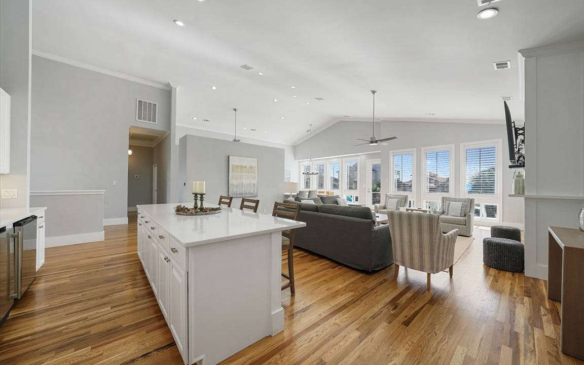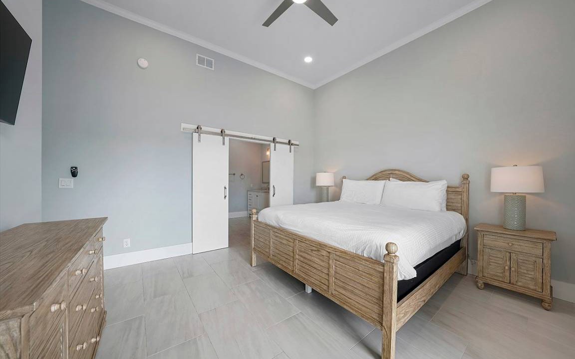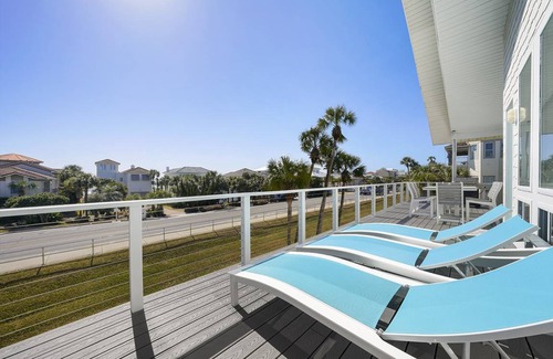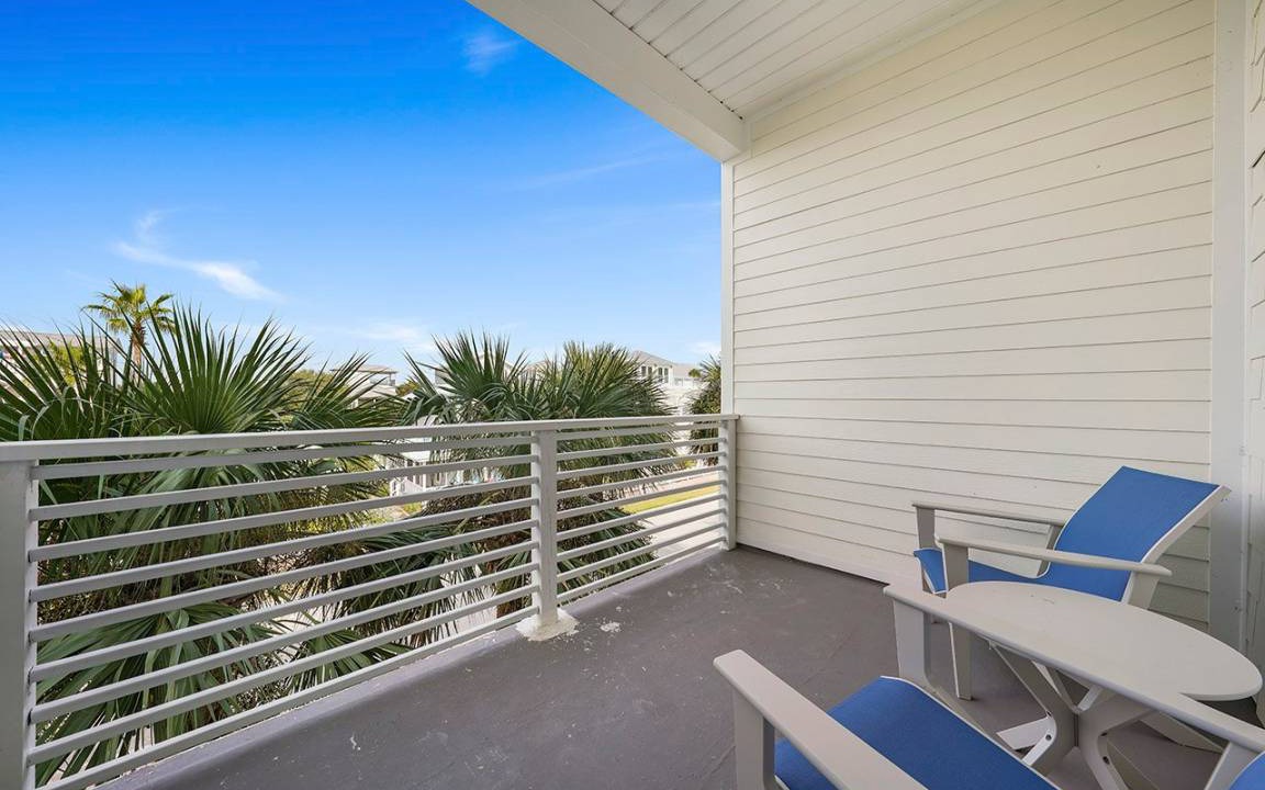 The second floor is complete with a wrap-around covered veranda and plenty of sunlight from windows spanning over the back side of the home. The large, open living area is designed for entertaining and includes two plush sofas, a flat-screen TV mounted over a fireplace, a renovated wet bar, and a spacious balcony with stellar Gulf views. The deck provides plenty of room for relaxing and alfresco dining. The formal dining area has seating for ten. The kitchen is equipped with state-of-the-art stainless steel appliances and spacious counters. The second-floor Master Suite provides guests with a spacious walk-in closet, a large stand-alone shower, a garden tub, and a private water closet. The second-floor Queen Suite has a private balcony and a shared full bath with a shower/tub combo. The laundry room is also located on the second floor.