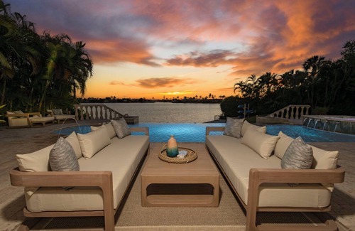 Tropical foliage encase this modern Cape Coral retreat in its surroundings. Burnt orange sunsets and blue water complement each other, and in the midst sits the villa’s pool, hot tub, and loungers, all facing the best view on Thunderbird Lake. Inside, large-scale artwork leads the way from the grand entrance to great room, past the chef's kitchen to the picture perfect outdoors.