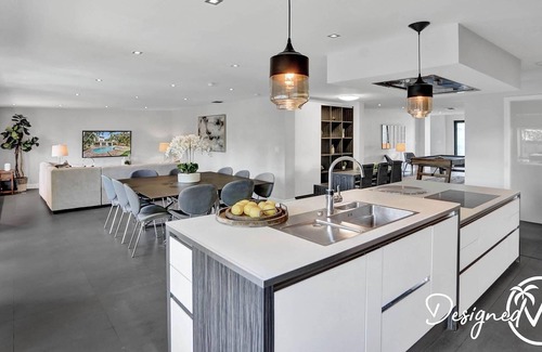 - Kitchen -Large island with cooktop, stainless steel appliances, ample cabinetry. We provide coffee, salt, pepper and spices. We also have small appliances including a hand mixer, mini food chopper, blender, toaster, coffee-maker. Basic cookware, cutlery and pots and pans.