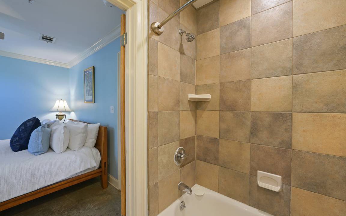 Also on this level is the king primary bedroom with a private bath. This room has a closet, a tall dresser with ample storage, and a private flat-screen TV. The private full bathroom features a single vanity, bright cheery colors, and a tub & shower combination bath. There is also a new stackable washer/dryer tucked into the closet of this room. The second bedroom off the living room features a queen bed and a private bath as well. This bedroom features a large mounted flat screen TV, two nightstands for storage, a closet, and has access to the balcony via French doors. The full bath features a single vanity and a tub and shower combination bath.