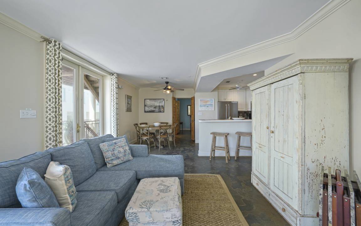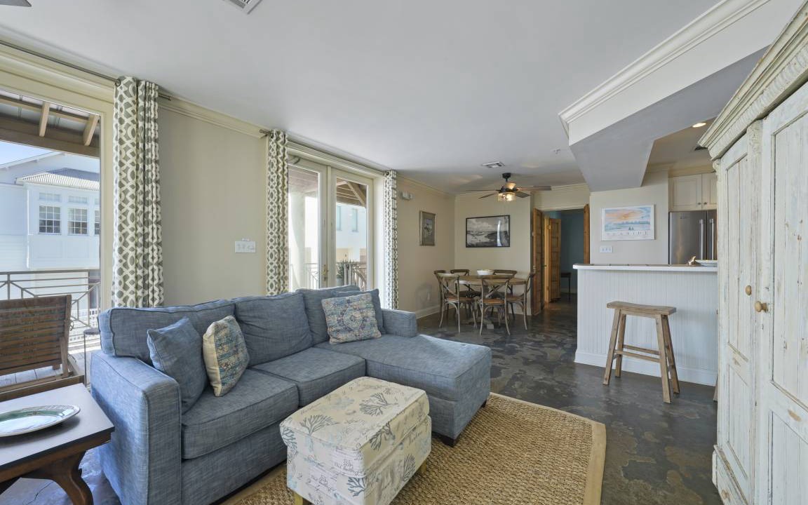 As one of the few dog-friendly rentals in Seaside, Cherished by the Sea is conveniently located above the shops of Ruskin Place Artist Colony and showcases phenomenal views of the town and gulf views from your second-story expansive wrap-around balcony! Entry is on the second floor of the building to this corner townhouse via a set of stairs that lead to the generous open-air balcony with ample seating to enjoy the spectacular sights of the town. Without a doubt, some of the best people-watching and views in Seaside are in store for guests of this well-kept townhome. The phenomenal outdoor living balcony consists of many sitting configurations. The first area features three chaise loungers perfect for lazy afternoons, taking in the town views. The second area features a set of four Adirondack chairs perfect for an evening nightcap or morning coffee. Overlooking the shops of Ruskin Park you have an outdoor dining table to seat six that is perfect for dining al fresco. The balcony is completed by an outdoor gas grill.