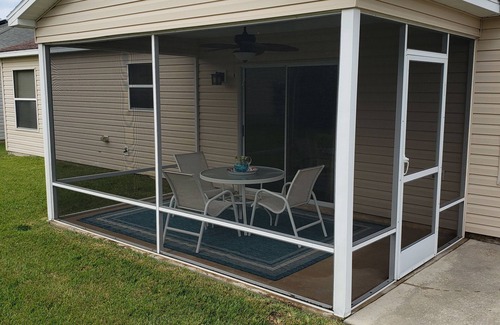 Guest bedrooms have 1 king / 1queen size beds, closets and one also includes a desk with an available computer printer. A pocket door separates rooms from living area. The bathroom has tub/shower and linen closet, with plenty of towels and linens, including beach towels. The open concept living area includes new reclining furniture along with 55inch smart TV with high speed WiFi. Beautiful dining area seats 6, with 3 more seats available at the island. Kitchen is complete with everything you will need to prepare and serve meals. Keurig coffee maker, Cuisinart oven/toaster/air fryer available. Luxury vinyl flooring throughout. In-home laundry. Utility sink in the two-car garage. Enjoy your morning coffee in the spacious lanai with ceiling fan. Included is a two-seat gas golf cart. Ride the trails to the over 50 golf courses, restaurants and shopping. Village IDs are not required for renters to occupy a home, however if you would like to enjoy any of the amenities that all renters and owners are entitled to, you will need to have a villages identification card. With your Village Resident Passes you can play all of the Villages executive and championship golf courses. If golf isn’t your thing, check out the over 80 pools, or other activities such as pickle ball, tennis, shuffleboard, horseshoes, bocce ball, corn hole, the walking trails or inside rooms with billiards, cards or bunco. Additional guest passes for your visiting guests are available for no charge from Laurel Manor Rec Center. And don’t forget to enjoy music and/or dancing in the squares nightly from 5p-9p. Rentals are 7 days or longer. For long term rental of 30 days or longer, one of the renters MUST be 55 years or older.