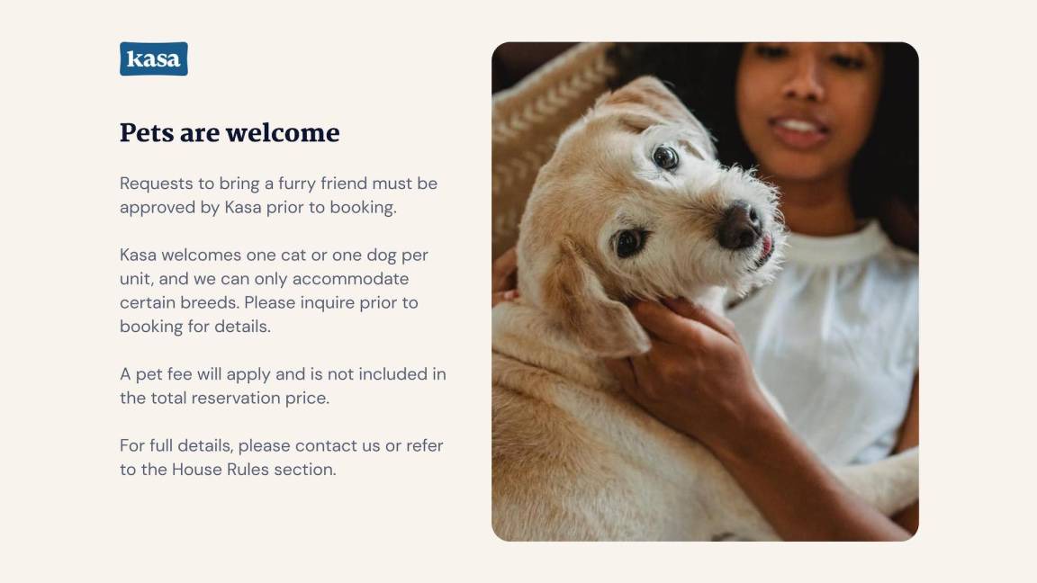 - Kasa welcomes one dog or one cat per unit, and a pet fee will apply based on the length of your reservation: $20 per night for 1-6 nights; $16 per night for 7-28 nights; or $8 per night for 29+ nights. Please refer to our Guest Accommodation Agreement regarding the dog breeds we allow at our property.