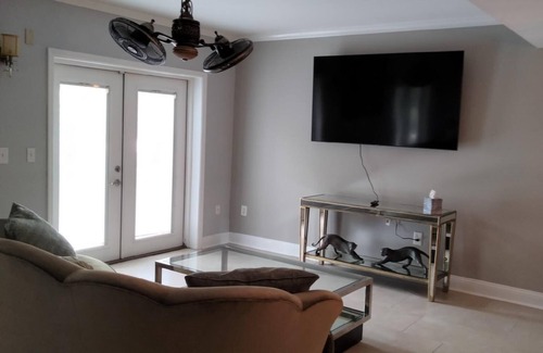 You will find a luxury feel with beautiful palace like fixtures . Ample room for a nice family stay or just a romantic get a way. Each floor is dressed and unique in its own way. Beautiful back patio with custom outdoor kitchen to have a fun cooking out and relaxing night in .
