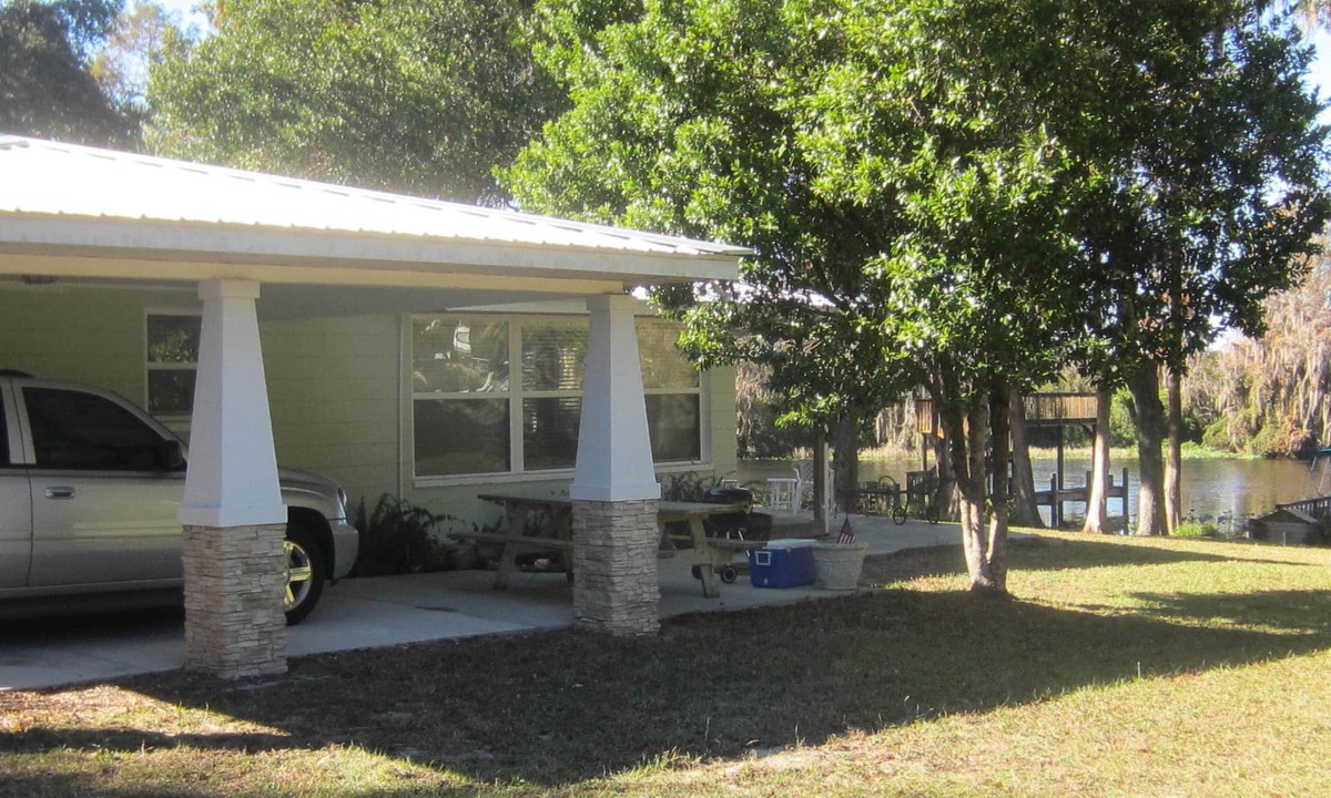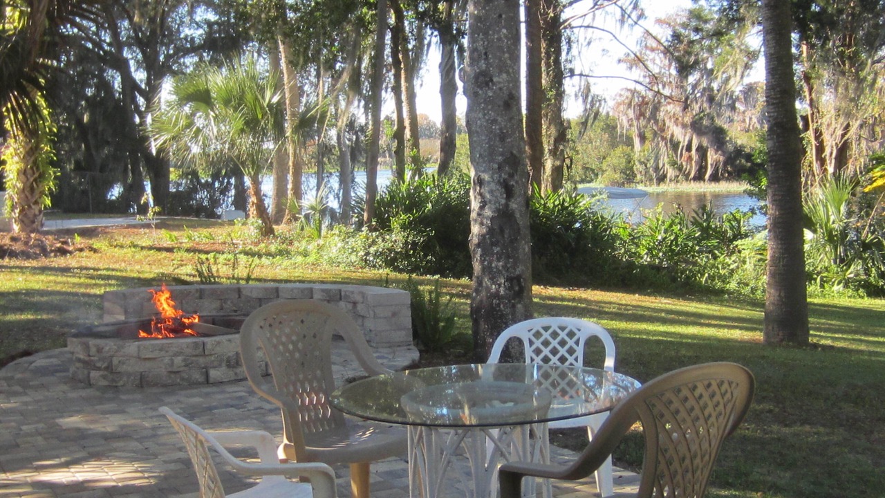 Old Florida stone columns outline the large open air carport. The walkway wraps around to the backyard which has a stone pavers courtyard complete with a wood burning fire pit and charcoal grill. The stone paver walkway weaves its way to the boat dock. The courtyard is perfect for a BBQ cookout, entertaining guests or just relaxing and watching the river flow by.