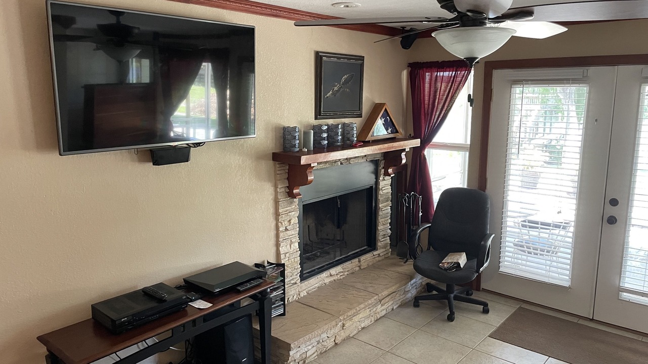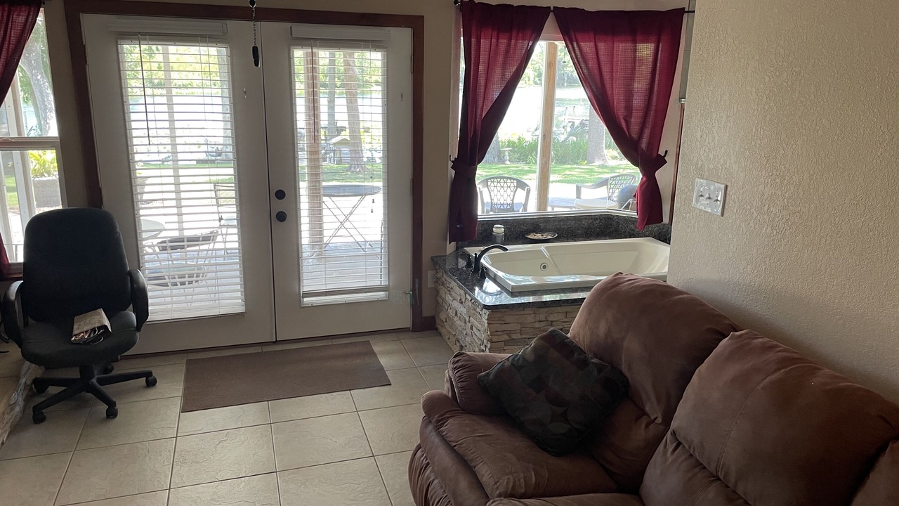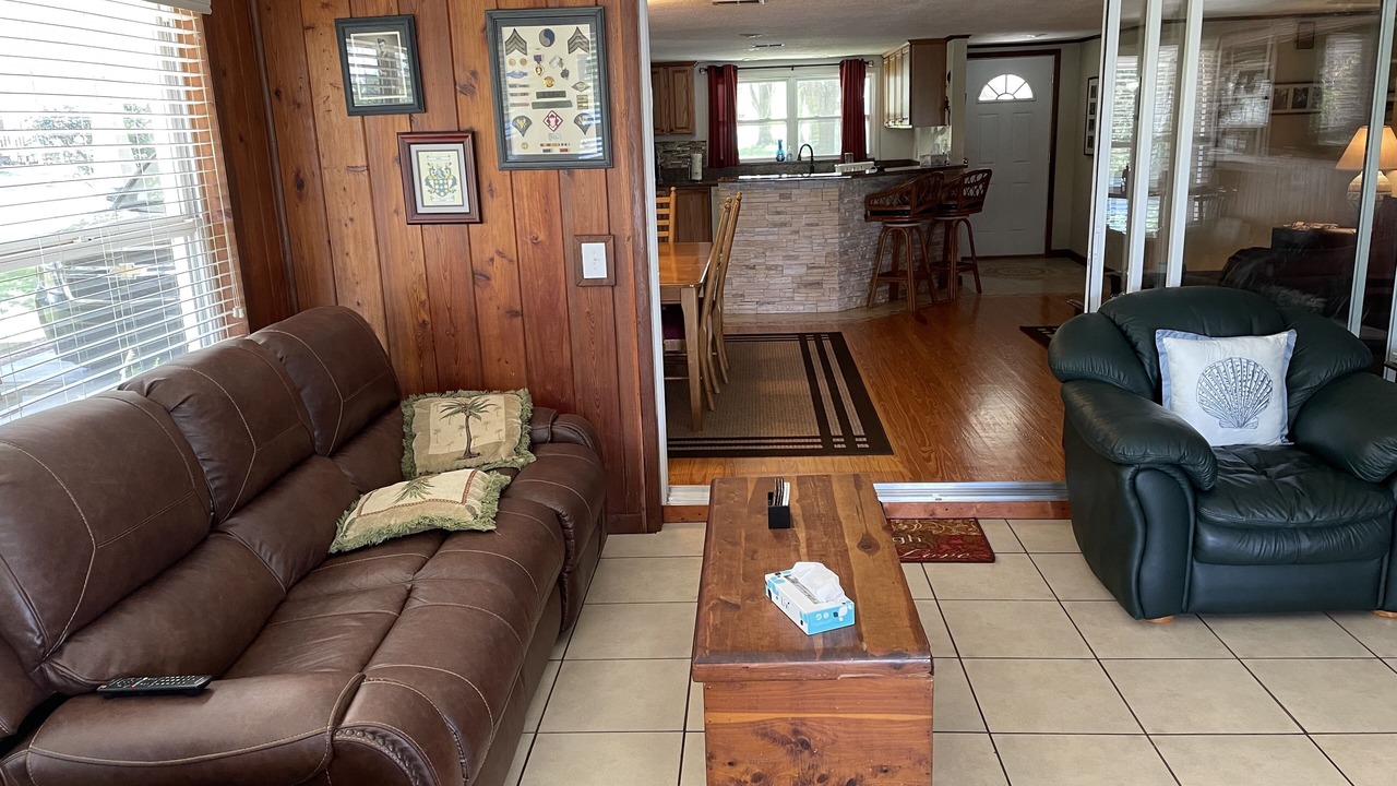 The spacious living room features hardwood floors and beautiful wood panel Florida room with french doors, and a smart TV. This room has a nice view of the backyard and river. It provides a wonderful space to entertain or just relax.