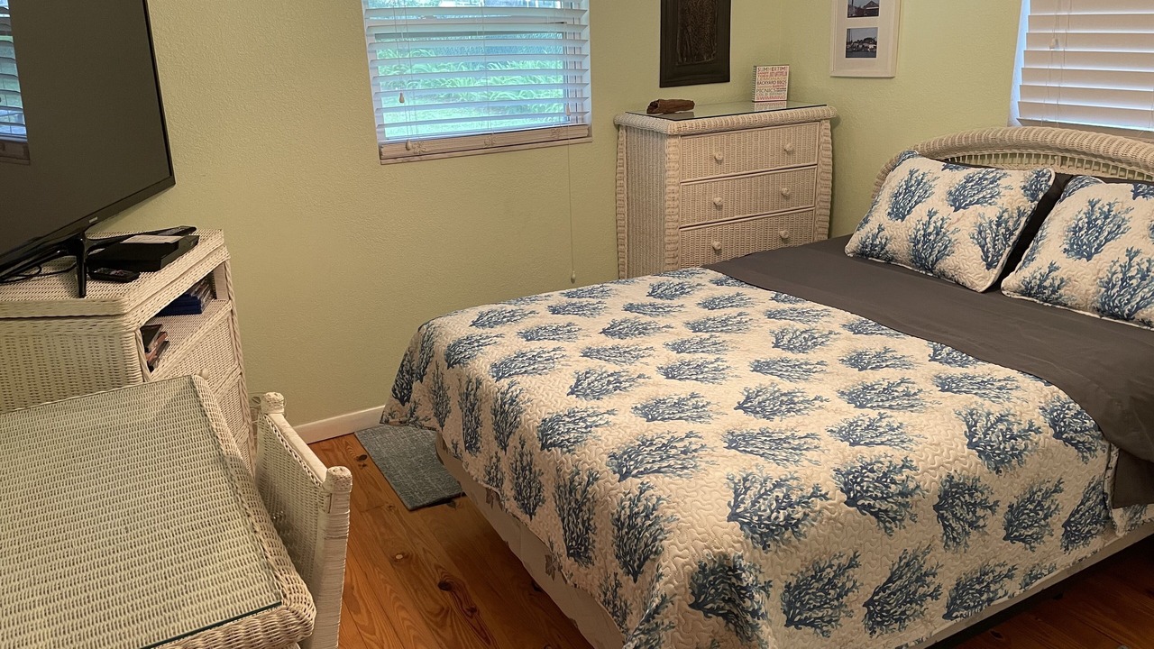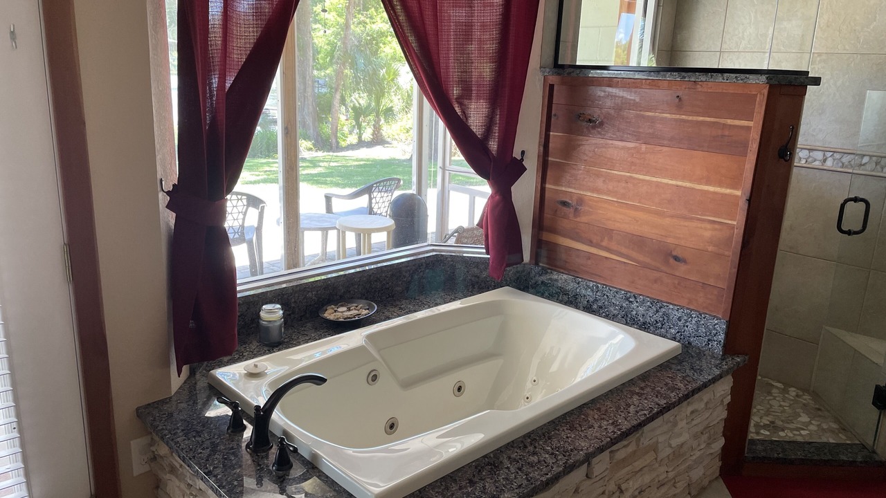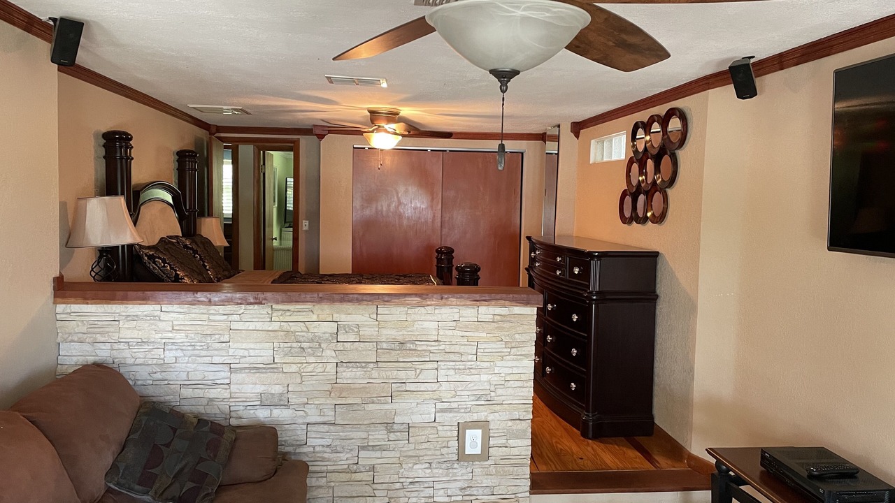 The Master Suite has hardwood floors, a queen size bed and a half wall loft that overlooks the master suite. This upscale master suite has it all. A cherry mantle over a wood burning fireplace and smart tv, blue-ray DVD, 5 disk CD player with Sony surround sound. All of this in combination with the private bathroom which features a large mirrored granite top vanity, rain shower and whirlpool Jacuzzi tub. The bay window showcases the courtyard and view of the river. The blend of cherrywood is exquisitely done and enhances this relaxing spacious master suite. There is also a stackable washer and dryer. A screen porch with two ceiling fans offers a relaxing outdoor environment. Wifi is provided.