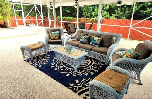 Beautiful newly renovated single-story 5 bedroom, 3 bath home. The perfect place for a family or the savvy business traveler. The huge backyard with pool and spa oasis is fully screened for your comfort. Expansive covered areas with 5 outdoor ceiling fans allow you to gather comfortably with all registered guests rain or shine. Beautiful place to dine outside under the stars. Day visitors are permitted with host approval.