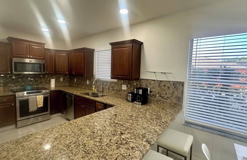 Reconnect with loved ones in this family-friendly place. This property is located in beautiful Lehigh Acres. Just minutes away from main roads(SR 82, Daniel Parkway, Colonial Blvd, I-75). This property has a big backyard with a large screened lanai to enjoy the sunset or sit by the fire pit. A spacious master bedroom with a 43” smart TV. A den with double full beds and a 43” smart TV. Two bedrooms with double twin beds. There are linens, pillows, blankets and comforters. The granite counter top kitchen is fully equipped with pots, pans, dishes, utensils, glasses, cooking basics, etc. There a refrigerator, stove, dishwasher, drip coffee maker, tea kettle, blender, toaster and microwave. The living room has a 75” smart tv and a fireplace. There is free WiFi, central A/C & heating, washer/dryer, hair dryer, complimentary toiletries. The lanai is furnished and has a gas grill. This property is pet friendly. Pet fee is $50 and it has to be paid when booking, This is a Single-story home and requires 1 step to enter.
