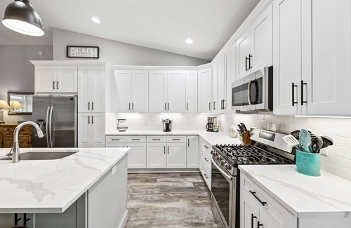 The second level of the home encompasses the living and kitchen area, which opens up directly to the screened-in porch. The kitchen features sparkling white quartz countertops and stainless-steel appliances. There is room for 10 people to eat comfortably at both the kitchen's bar and dining table. The living room also features 2 cozy sofas and chairs around the flat-screen TV. The remaining bedrooms can also be found on this floor, beginning with the primary suite, which has a king bed and private bathroom. The next room has a queen bed and private bathroom, while the neighboring room has a king bed and private bathroom. The final guest room features 2 full-size beds with a private bathroom.
