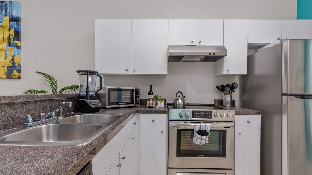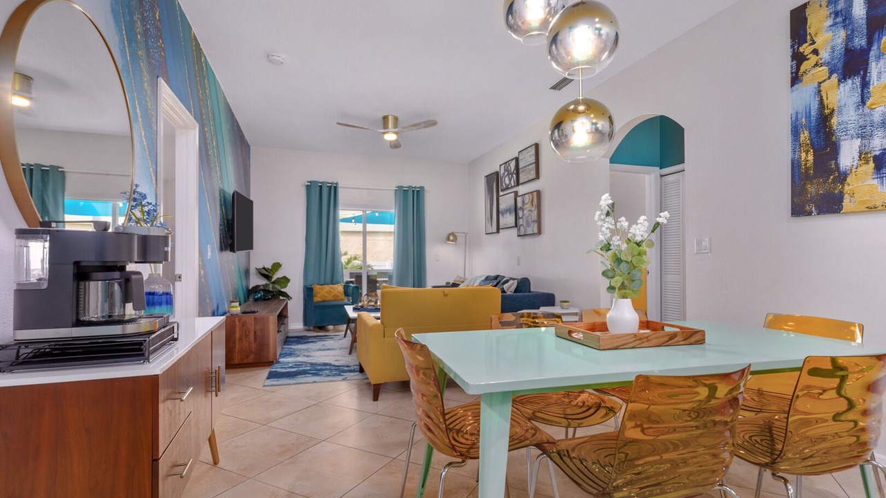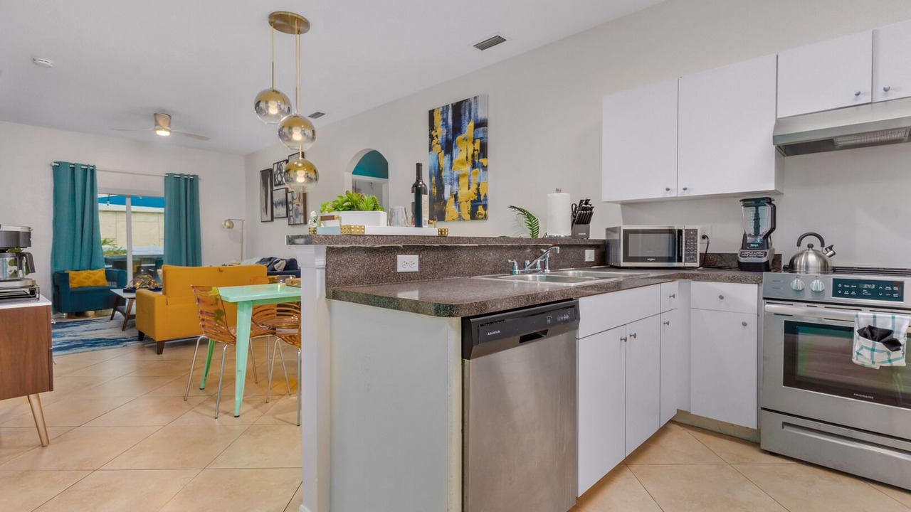 - Coffee bar w/ Keurig, French press + drip coffee machine