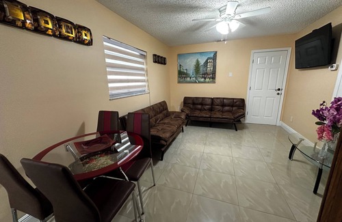 Located in Tampa, enjoy what this 1-bedroom apartment has to offer. This gorgeous space features a cozy and spacious 1 bedroom home with multiple closets, family room, dinning room and kitchen. House has a queen bed and a foldable twin bed in the bedroom. The family room features two full sofa beds. Roku TV and WiFi. Bathroom is wheelchair accessible. 4 sitting dining table and great outdoor seating and BBQ available. Private parking with gated house and independent entrance. 10-15 min from Tampa International Airport, Tampa Zoo within walking distance, 25 min from Clearwater Beach and 10 min from Downtown.A tremendous place to call homebase while you're away, we hope you enjoy your stay.