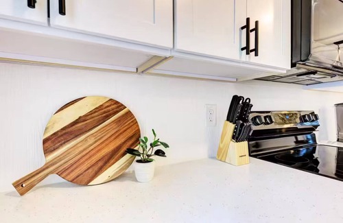 This comfortable living area is perfect for starting the day with your cup of coffee or winding down your night with a drink. The 65" Smart HDTV has a complimentary Netflix subscription to keep you up-to-date with the latest show you've been bingeing. Whether you're looking to kick back and relax or catch up on your favorite shows, this living area has everything you need. You also have a full-sized washer and dryer in this unit.
