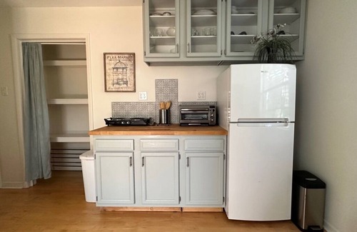 Apartment size refrigerator with top freezer, double hotplates, oven, toaster, microwave, coffee maker, tea kettle, crock pot, rice cooker, dishes, silverware, utensils, glasses, mugs, pots, pans, cutting boards, measuring cups, can opener, bottle opener, large sink, drying rack, dish washing detergent and brush, trashcan, recycling, shoe rack, closet size pantry with large shelves, cart, ladder, step stool, tons of cabinets.