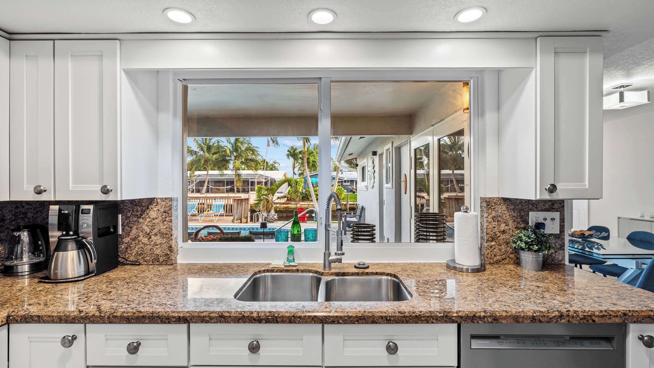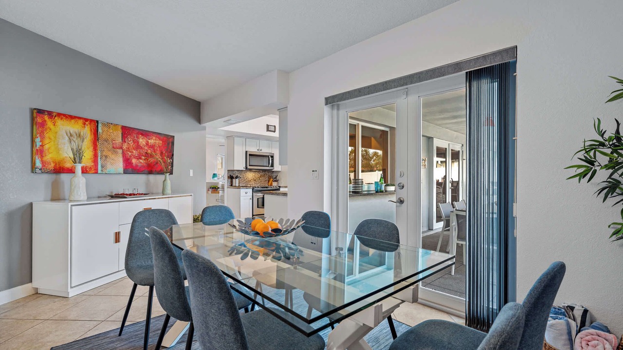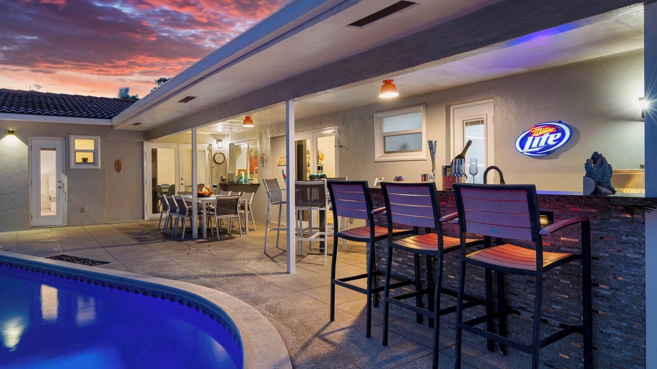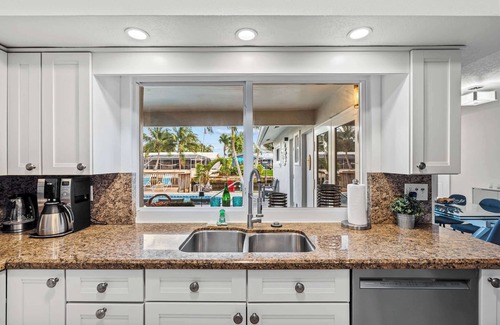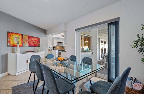 This stylish 4-bedroom, 2-bathroom retreat delivers a slice of modern luxury. The open-concept living room features sleek designer furnishings and a large flatscreen TV, perfect for relaxing after a day in the sun. The fully equipped kitchen showcases granite countertops, stainless steel appliances, and everything you need to whip up meals at home. A formal dining room with views of the backyard adds a touch of elegance to every gathering. Need to check in with the real world? There's a cozy sunroom/office space with a breakfast bar, scenic views, and a house computer (with Wi-Fi included, of course).