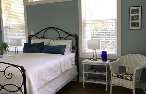 The cottage is free standing and separated from the main home by a lovely porch/breezeway area. Tastefully furnished with large bedroom suite + super comfortable queen size bed. Open floor plan Living/dining/kitchen combo. High ceilings, floor to ceiling windows, gas fireplace; nice cabinetry and trim work and wood floors throughout. Pullout full size sofa bed. Kitchen is fully equipped with cooktop, microwave oven, full size refrigerator and all cooking utensils. Lux bedding and linens. Large walk in closet. Please note there is no washer and dryer in the guesthouse.