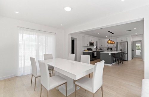 Enjoy this open living space from the entryway through the dining room, kitchen and living room. Lots of enjoyable seating for everyone. Enjoy the unique modern dining room window which is a one of a kind in southern Florida. The kitchen had been fully renovated with all new appliances along with the bathrooms. Brand new washer and dryer available right outside the kitchen. You have full access to the fenced in backyard and access to 3 beautiful nearby beaches. Each about an 8-minute drive away. 5-minute drive to Mizner park with wonderful restaurants and entertainment. This house is in a PRIME location! The home is styled with modern furnishings which gives you true vacation vibes!