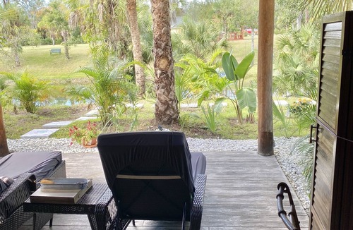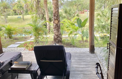 Your exotic Glamping in Florida. Take it easy at this unique and tranquil getaway. Feel the warmth of this tropical paradise. Located on a fresh water canal full of fish. A peddle boat and kayaks available.