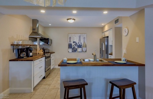 The living room of FOLLOW THE SUN is comfortably furnished, with plenty of light streaming in from the floor-to-ceiling glass doors. There's a large flat screen TV, for those times you aren't marveling at the breathtaking Key West sunsets from your private balcony. The living room sofa pulls out to a Queen sleeper to accommodate two extra guests. The kitchen has everything a good chef would need to prepare any meal. The dining table will seat six comfortably, and there's also a kitchen bar that seats four more.