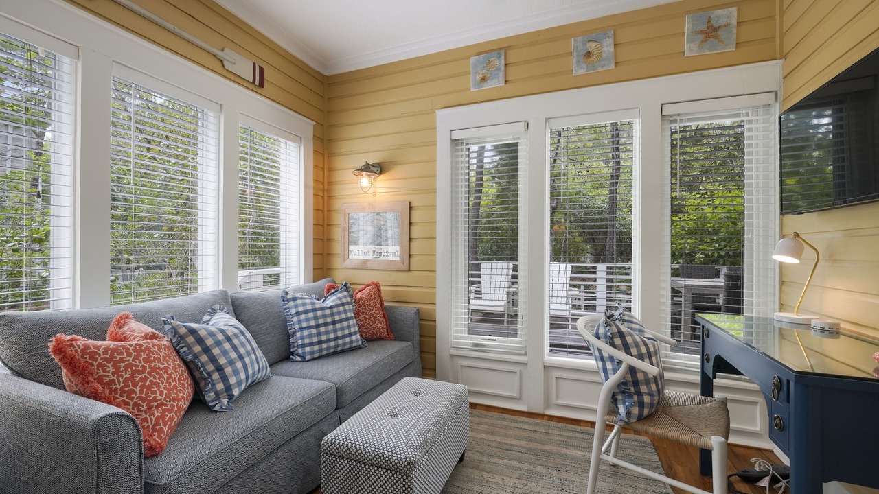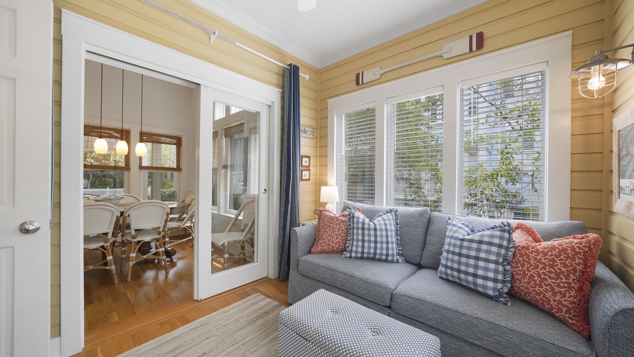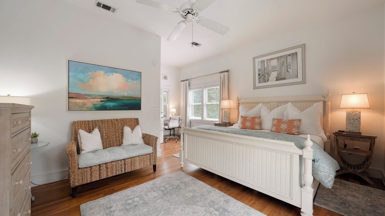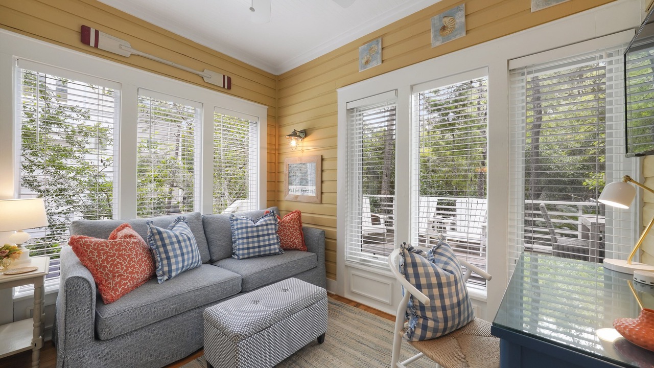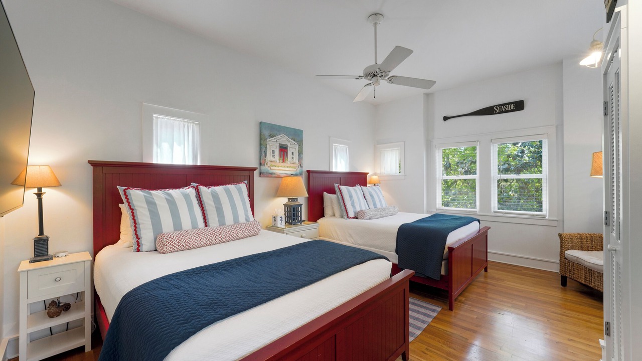 The second-floor king primary suite greets guests with tasteful touches of turquoise, creating a tranquil environment for lounging or relaxing after a long day of bike riding through Seaside. This room is complete with a private balcony. A guest room with two queen beds is a bright and coastal area, with seashells, coral blues, and pops of red! There is a shared full bath in between these two bedrooms. Outside the bedrooms, there is a large screened-in porch with Adirondack seating, a bistro dining set, and a comfortable swing to relax and unwind after a great day at the beach.