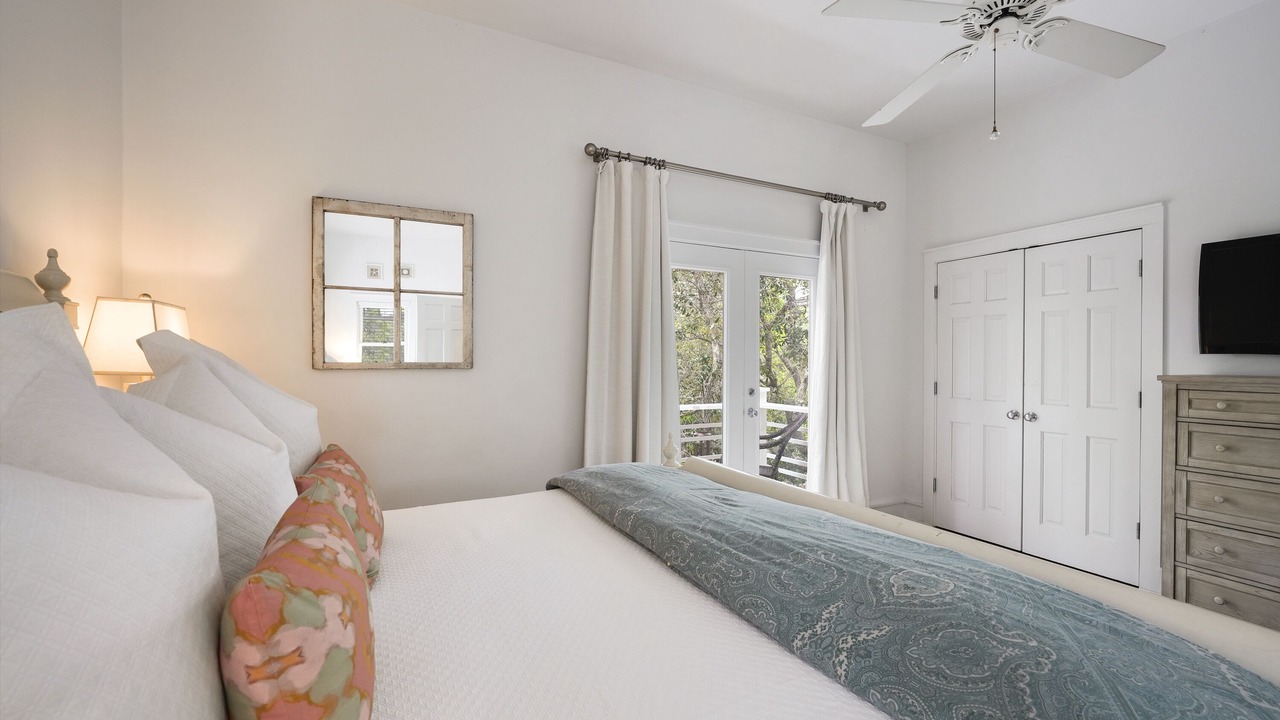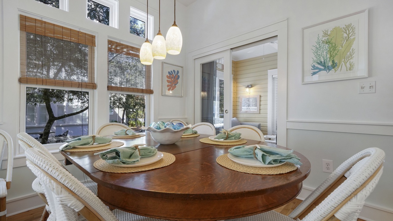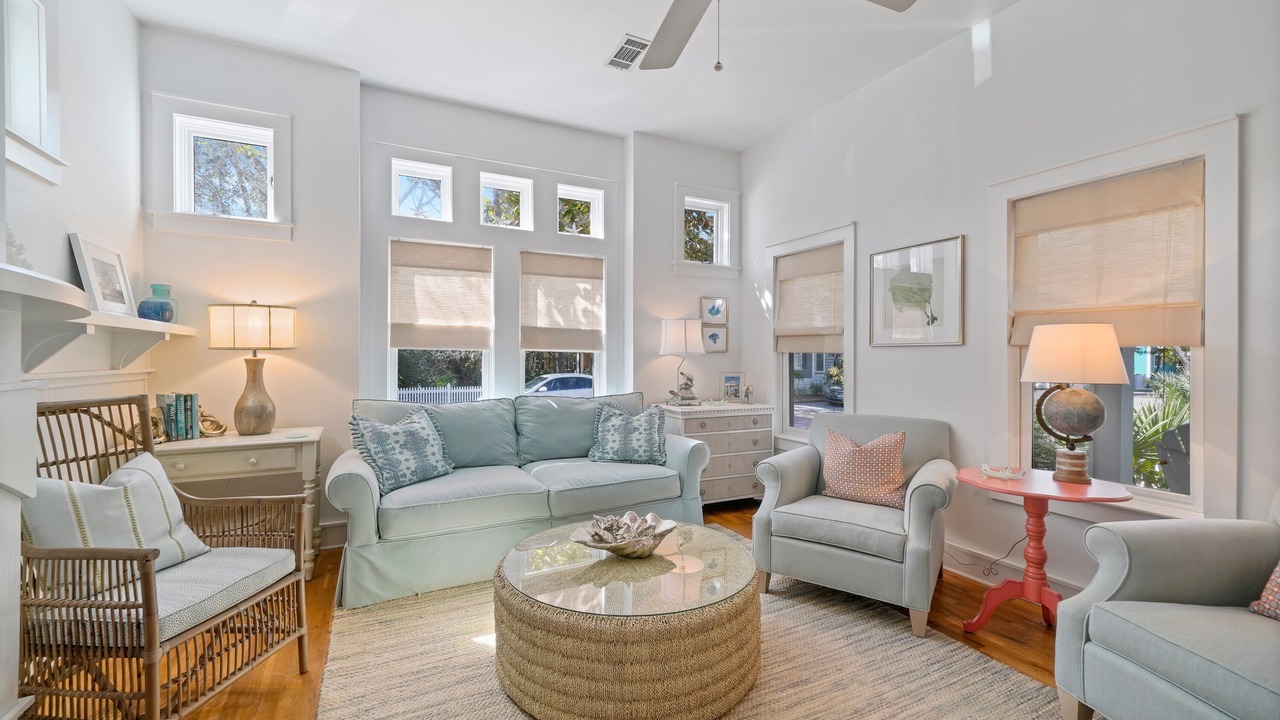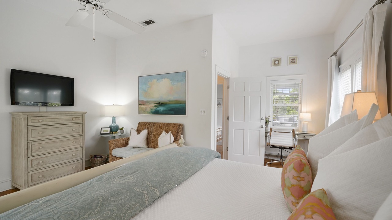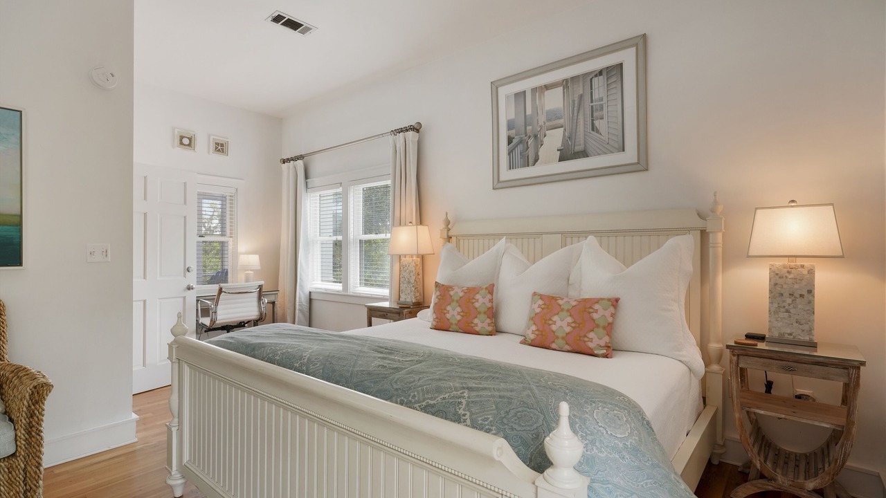 The second-floor king primary suite greets guests with tasteful touches of turquoise, creating a tranquil environment for lounging or relaxing after a long day of bike riding through Seaside. This room is complete with a private balcony. A guest room with two queen beds is a bright and coastal area, with seashells, coral blues, and pops of red! There is a shared full bath in between these two bedrooms. Outside the bedrooms, there is a large screened-in porch with Adirondack seating, a bistro dining set, and a comfortable swing to relax and unwind after a great day at the beach.