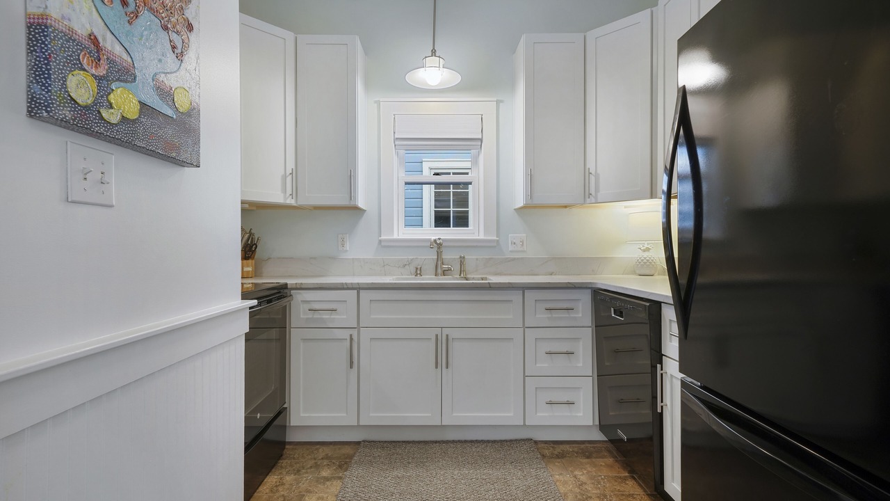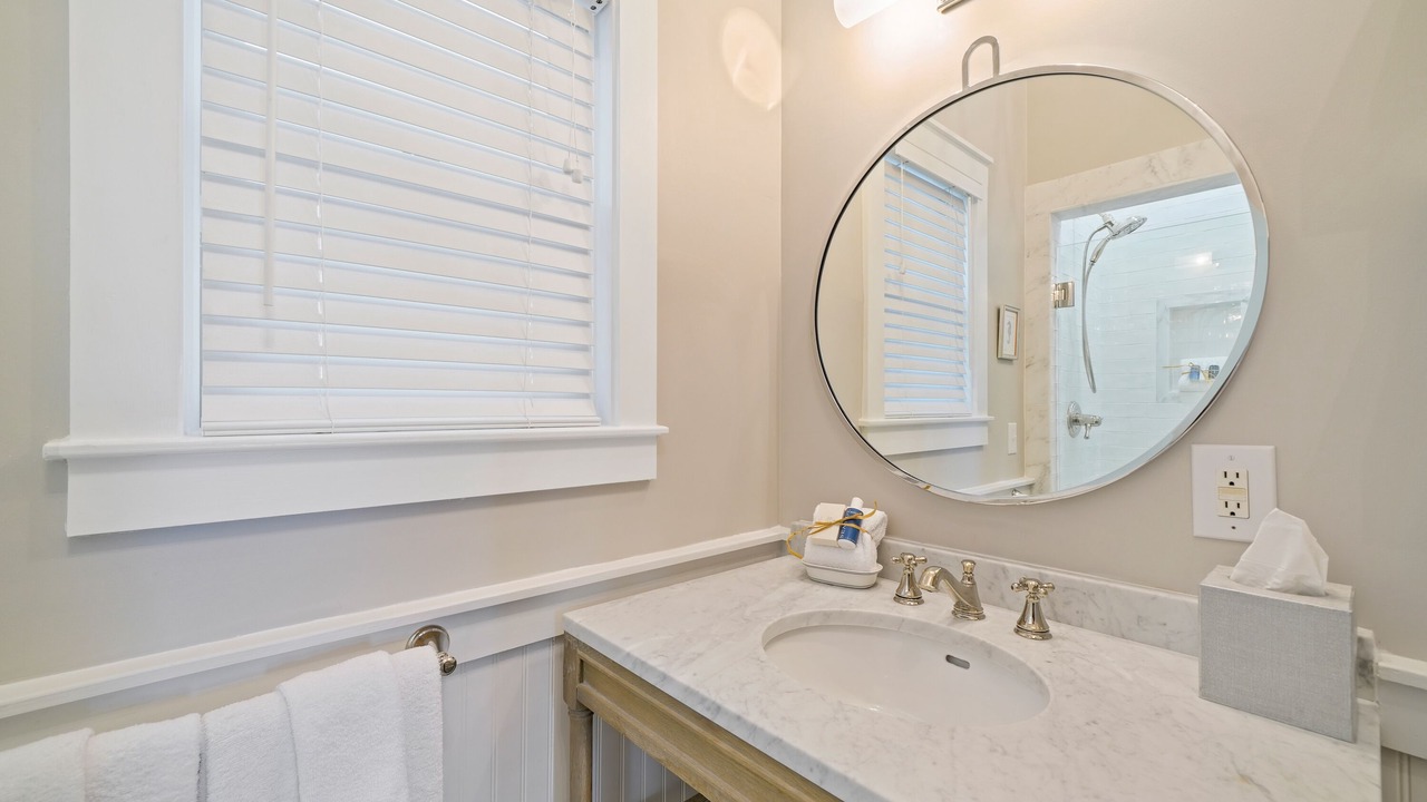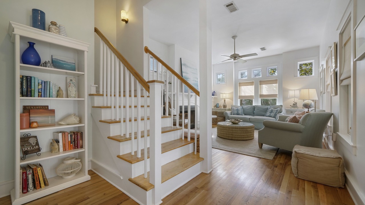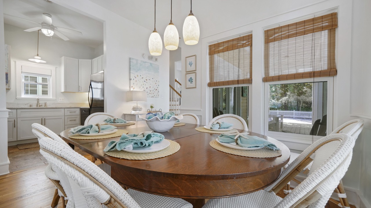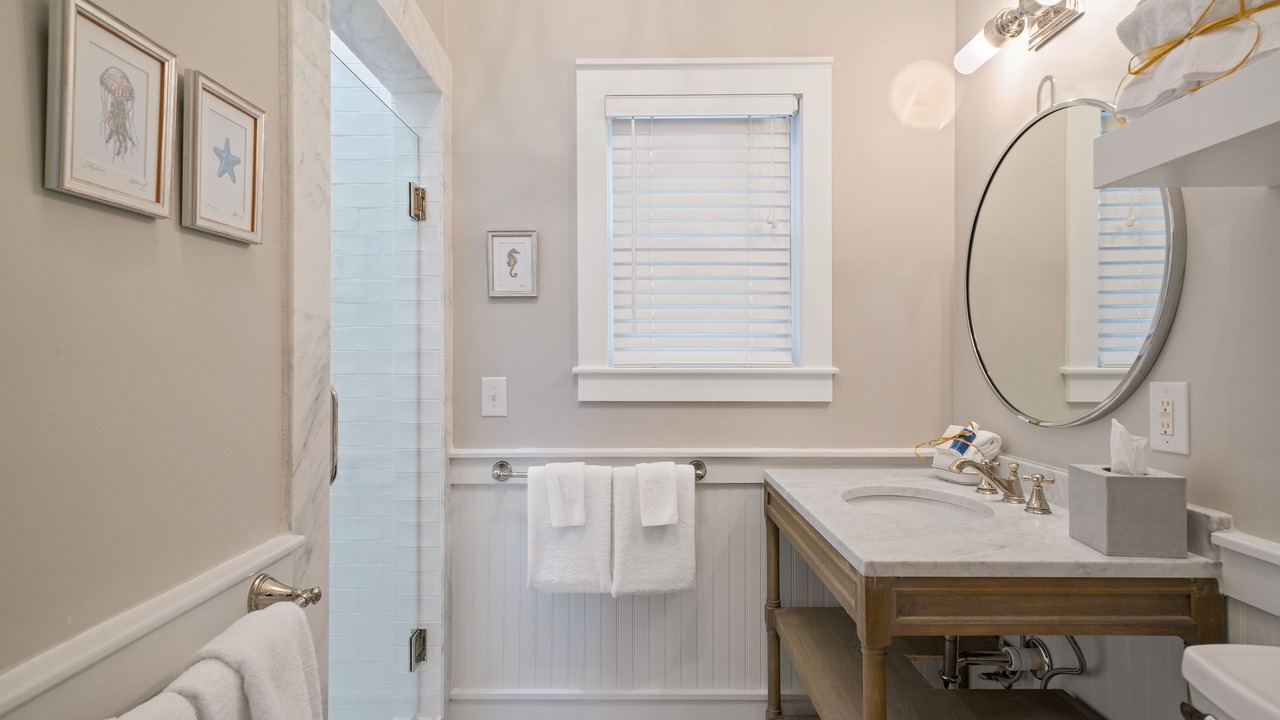 The second-floor king primary suite greets guests with tasteful touches of turquoise, creating a tranquil environment for lounging or relaxing after a long day of bike riding through Seaside. This room is complete with a private balcony. A guest room with two queen beds is a bright and coastal area, with seashells, coral blues, and pops of red! There is a shared full bath in between these two bedrooms. Outside the bedrooms, there is a large screened-in porch with Adirondack seating, a bistro dining set, and a comfortable swing to relax and unwind after a great day at the beach.