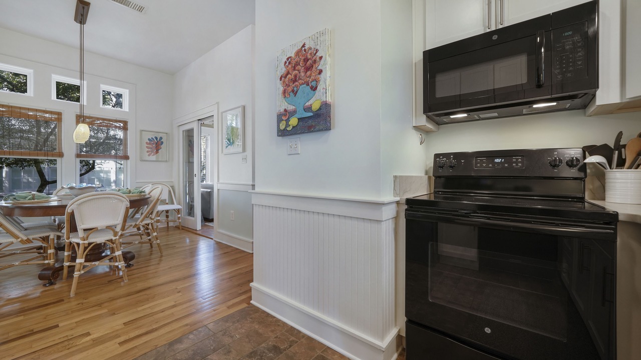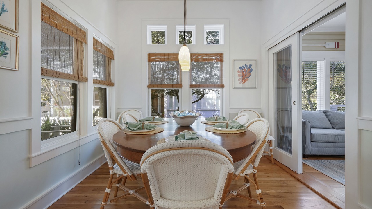 Purple hearts, magnolias, and maples greet you at the elegant multi-level home on Forest Street. Gentle breezes abound in this whimsical home, with beach cottage-themed living spaces throughout. Arrive and park in private parking, then head towards a furnished porch near the entry, then enter the living area, which is bright, spacious, and nautically inspired. A fully equipped kitchen and dining area is the perfect space to prepare meals, have a cup of coffee or a glass of wine, and a great place to entertain. Just off the dining area and rear deck is a bonus guest living area with a double sleeper sofa, great floor-to-ceiling windows, and a flat-screen TV across from the guest full bath. An open deck off of the kitchen and den features several Adirondack chairs and outdoor dining for relaxing in Florida’s magical night air.