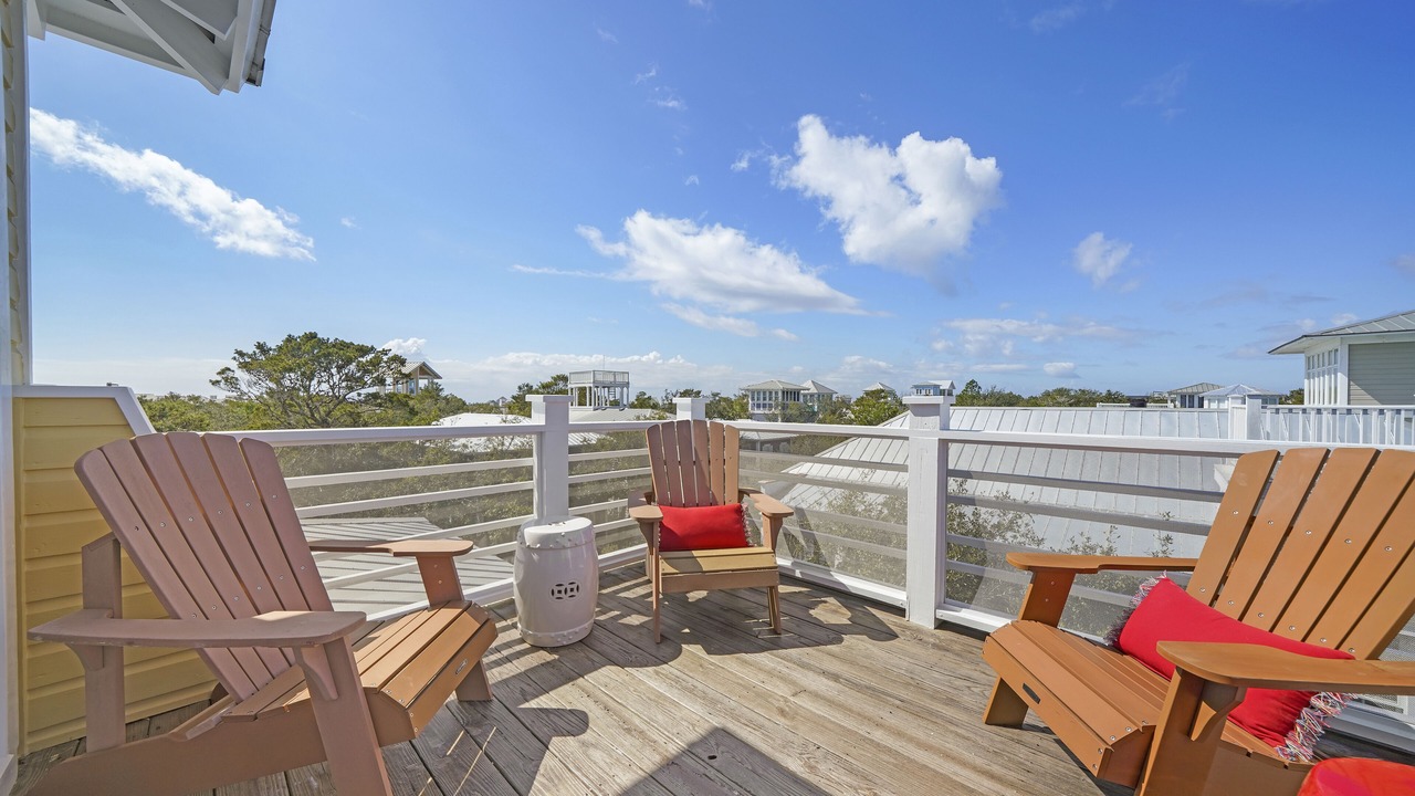 Guests can finally ascend to the third level, offering decorative art and more color. On this level, there is an enclosed tower area with an open-air observation deck, perfect for enjoying a nightcap or a good book, while viewing panoramas and the cerulean skies of Seaside, FL. What a perfect beach home to spend your next vacation at! Book your stay today.