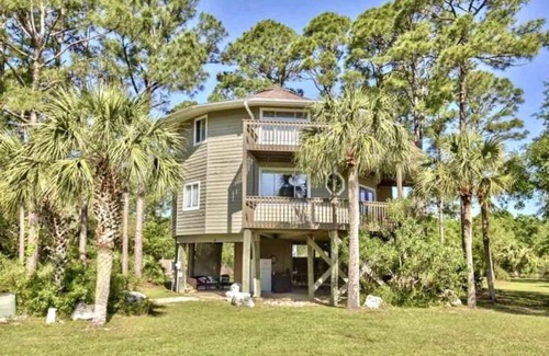 Beautiful home in small gated community with open floor plan on Dickerson Bay about 40 miles south of Tallahassee, FL. The house has a large, fully stocked modern kitchen with expansive windows facing the water. On our first floor there are 3 bedrooms (1 king, 1 queen, 1 set of bunks; full & single) along with 2 full bathrooms. The second floor contains the kitchen, living room, dining area, and a 4th bedroom with full bathroom. There are a total of 7 Smart TVs in the house. Each bedroom has its own TV, along with the living room and kitchen. The ground floor living area under the house has lots of seating with a TV, an outdoor shower, and a second fridge. There are two outdoor decks; one off Living Room, one off Master bedroom. There is patio furniture on the decks, which is not shown in the current set of pictures. Our home is located in the Port of Panacea Community. There is a neighborhood dock, pool, and large pavilion on the Bay available to you during your stay surrounded by some of the nicest people you would ever want to meet!