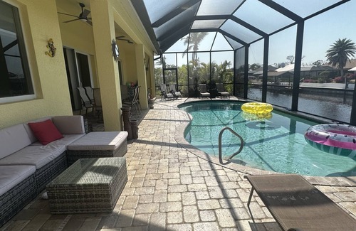 Come and enjoy Island Time in this beautiful 3 bedroom home with an amazing heated pool. This home has a large master bedroom with an incredible master bath including a soaking tub, walk in shower, his and her sinks and a vanity to make you feel right at home. Both guest rooms include queen beds, the living room and bonus room both have queen sized sofa beds. Fully stocked kitchen with two islands to cook up some freshly caught fish! Our community, Manatee Bay includes a boat ramp for easy drop in for your boat or kayaks. Lounge under the sun pool side or cool off in the pool over looking the canal. Come see what the Island life is all about! Property is non-smoking. Parties are not permitted. Community has quiet hours from10:00PM to 8:00AM.