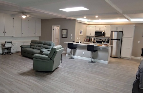 Enjoy a quiet evening on the furnished side patio, overlooking the yard before unwinding in the comfortable and inviting living area. The space has a leather reclining sofa, leather recliner and a 65 inch rotating flat-screen TV! A Bose small stereo can easily be st up with your favorite music from your own phone.