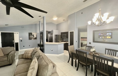This wonderful family home is impressive fully furnished with 4 bedrooms / 3 baths. It has 1,600 sqft in a quiet and safe community, the house has a private pool, free private parking, free wifi, washer and dryer, Roku TV, Very spacious and comfortable located close to many restaurants, shops, outlets, golf clubs and just minutes away from the main theme parks of Disney / Universal / Legoland.
