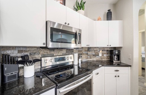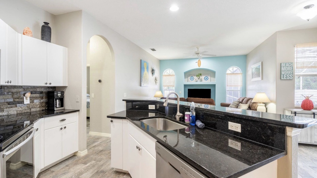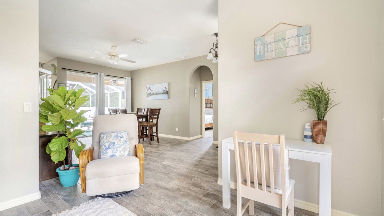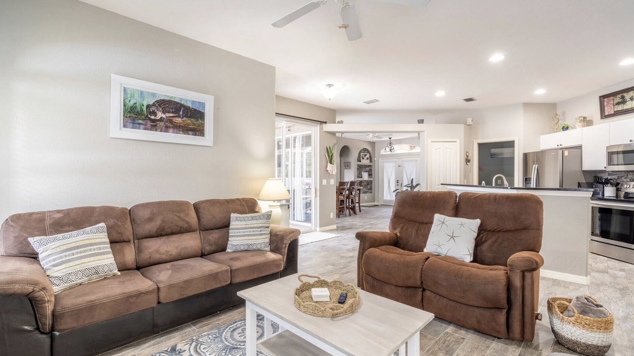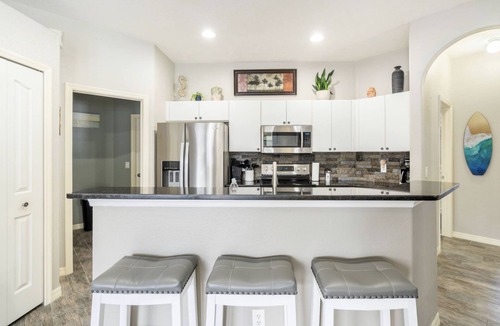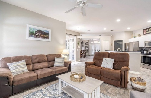 Beautiful 3ba/2ba house located on a very quiet street of North Port. Large heated salt water pool & spacious deck. Fully stocked kitchen-open and airy with high ceilings and a very private and quiet backyard. Smart Tv’s in each room. Less then 10 minute drive to hop on i75 and just a few minutes from shopping/necessities in North Port.