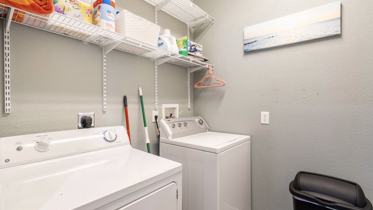 Laundry room is tucked away behind the kitchen. Dining table can seat up to 10. The garage is home to some bikes and beach gear for your trips to some of the most beautiful beaches in the US 🏝️