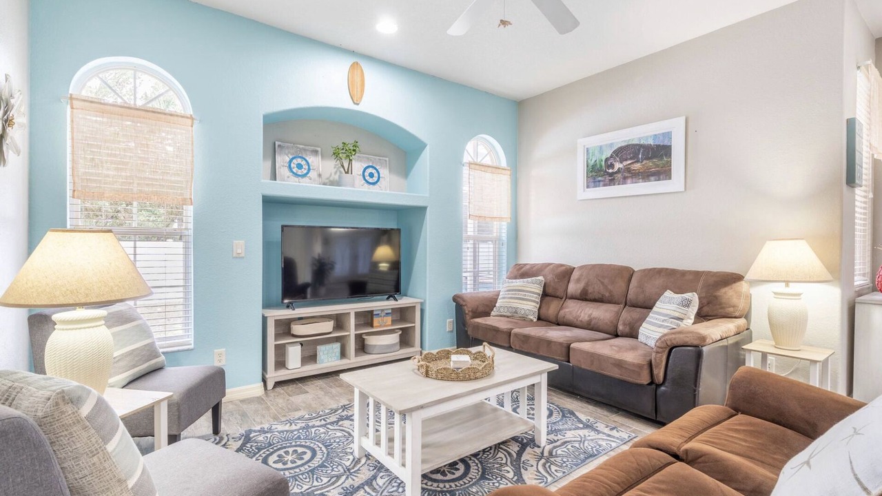 The couch in the living room pulls out to a queen to sleep two more if necessary. All rooms have a smart tv. A spacious pool deck with lots of places to cozy up after a swim in the warm salt water pool, and even a fireplace to sit around in the evenings.