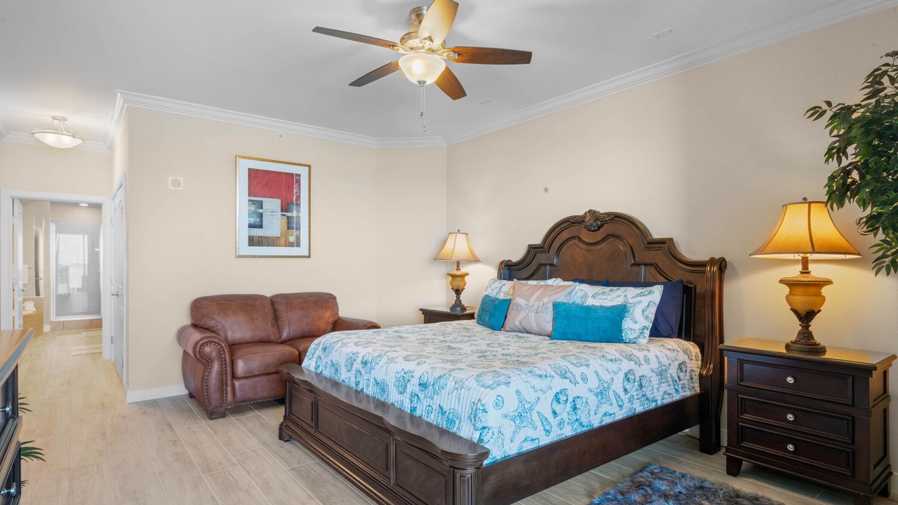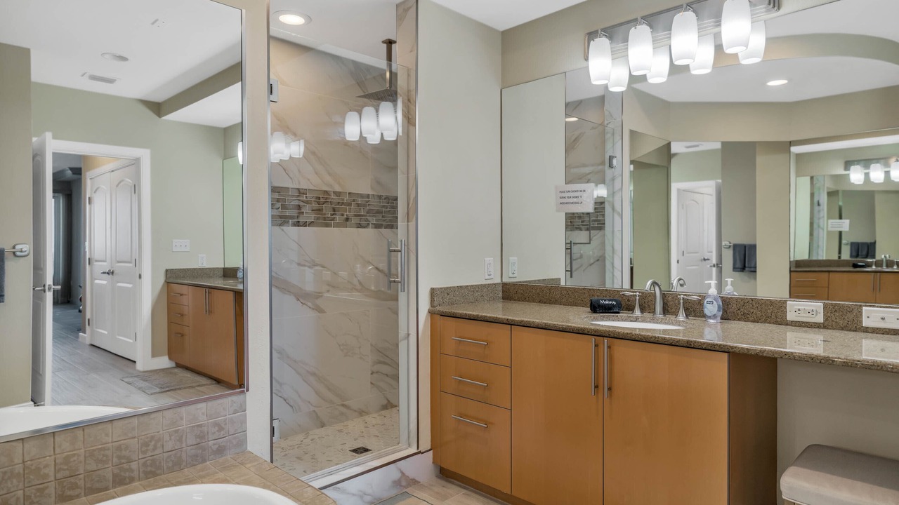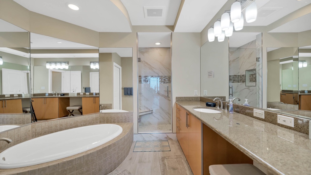 To the left of the living room is the master bedroom which is fitted with a king size bed, Italian leather loveseat, 55” smart TV, walk in closet, private balcony entrance. The private master bathroom has a garden tub, his & her vanities, and a large walk in shower.
