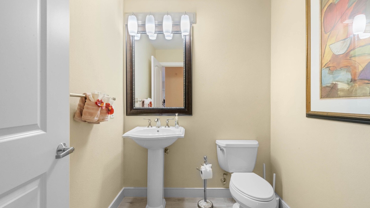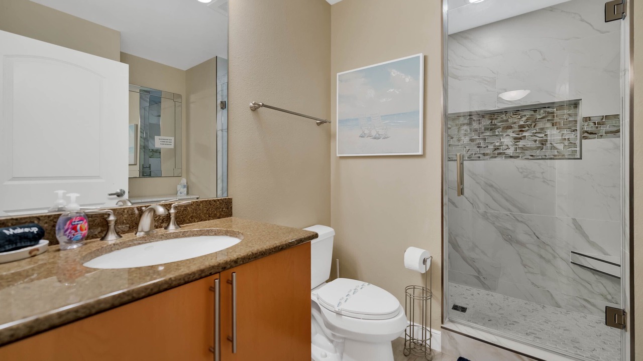To the right of the living room is dining area, entry to the half bath, and a door to the 2nd bedroom which boasts a queen size bed, a memory foam futon, a 55” smart TV, and a private balcony entrance. A private bathroom is attached that has a beautiful vanity with a large walk in shower.