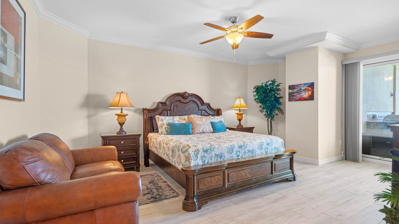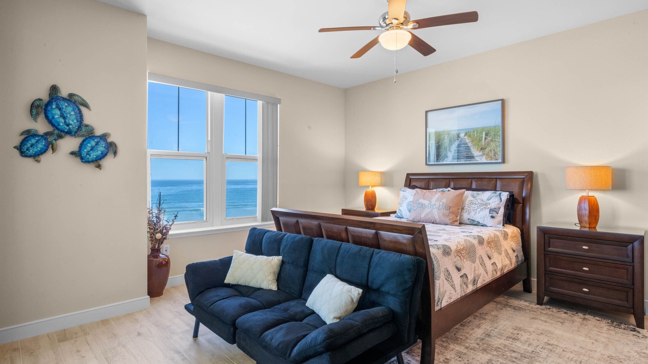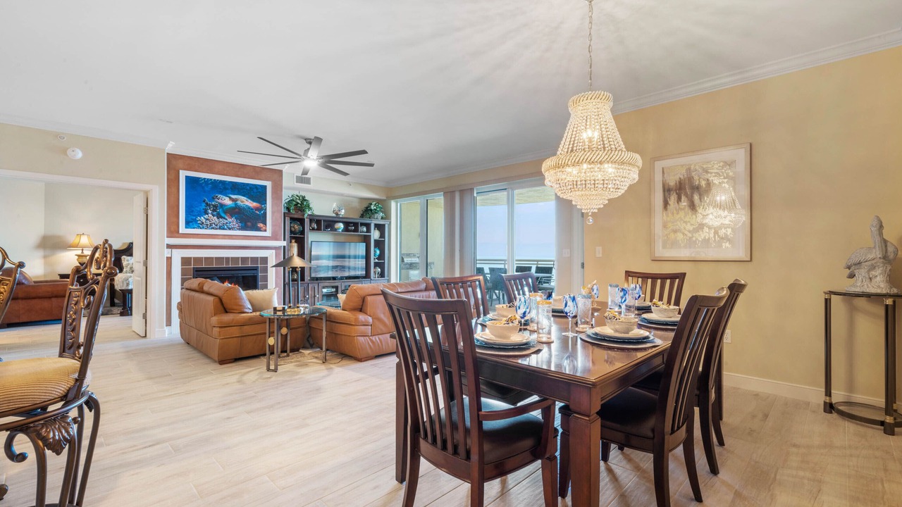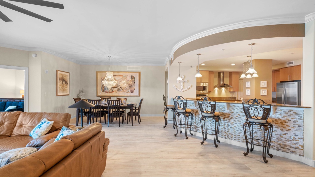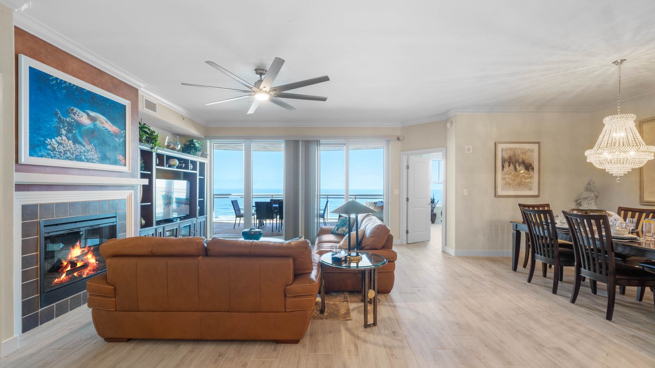 The living room boasts gorgeous Italian leather couches and a 55” smart tv with direct oceanfront views and a sliding glass door to access the balcony. The dining room has a low top table with seating for 6 as well as the additional bar seating at the kitchen.