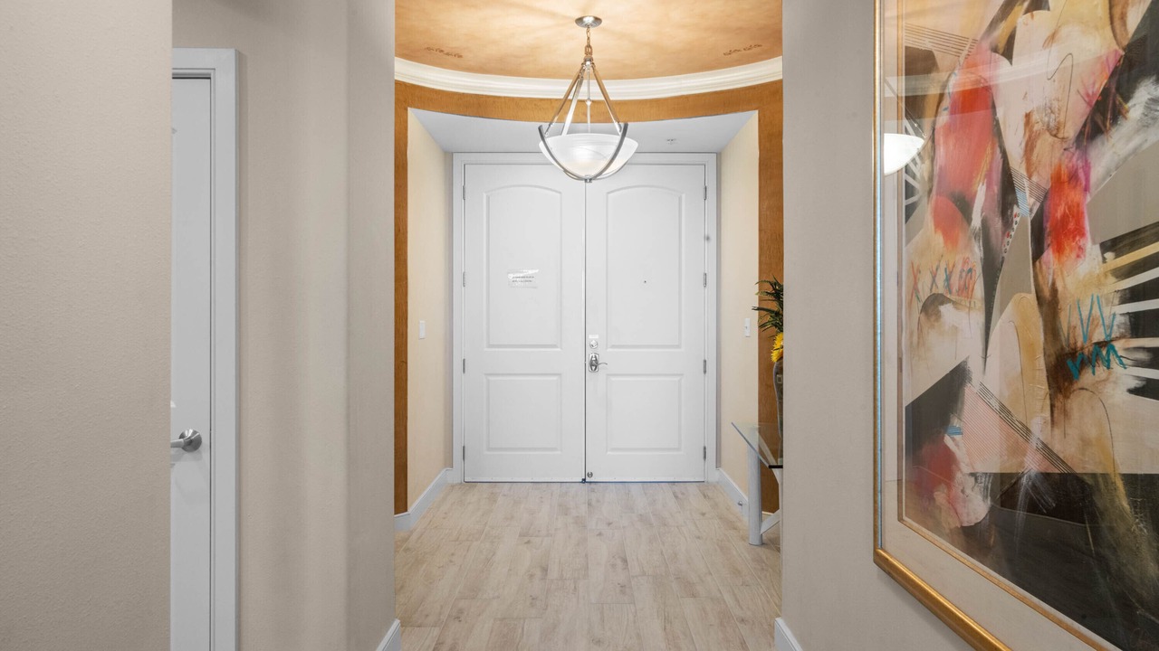 you walk through the double doors under a rotunda ceiling with a chandelier.